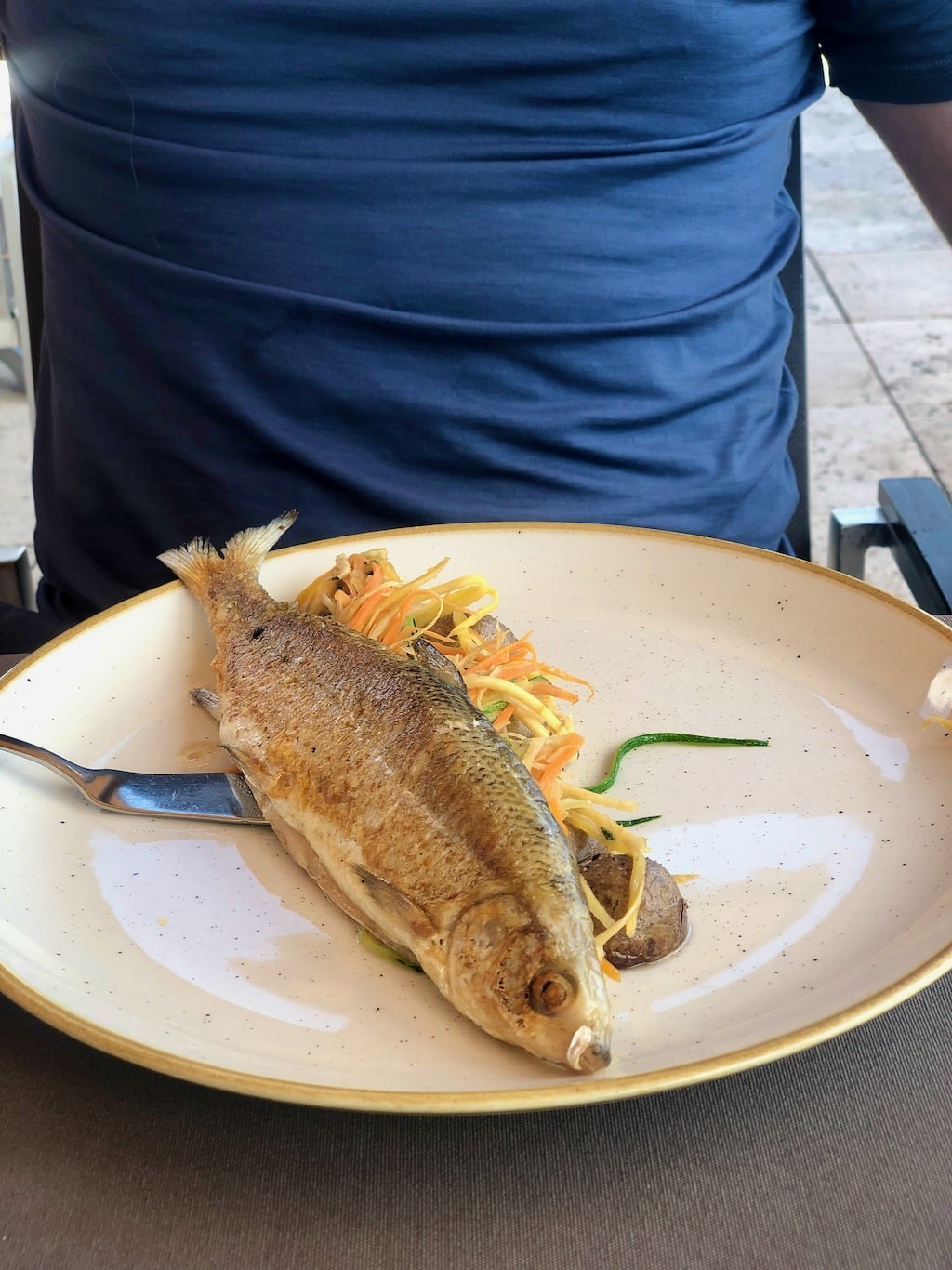 Besonders gut gefallen hat uns das drei Gänge Menü am Samstag und Sonntag Abend, das wir genießen durften. Nach Voranmeldung werden sowohl Hausgäste als auch externe Gäste mit einem Überraschungsmenü verwöhnt, bei dem besonders auf Regionalität und Qualität geachtet wird. Am ersten Abend war der Saibling mit Kapernsauce, gebratenem Gemüse und Petersilien-Kartoffeln unser Favorit. Am zweiten Abend war es ebenfalls die Hauptspeise, die es uns antat: Gefüllte Hühnerbrust mit Hühner-Tomaten-Olivenmus auf einer genialen Sauce mit reichlich Gemüse und geräuchertem Kartoffelpüree. Doch auch beide Vor- und Nachspeisen waren vorzüglich.