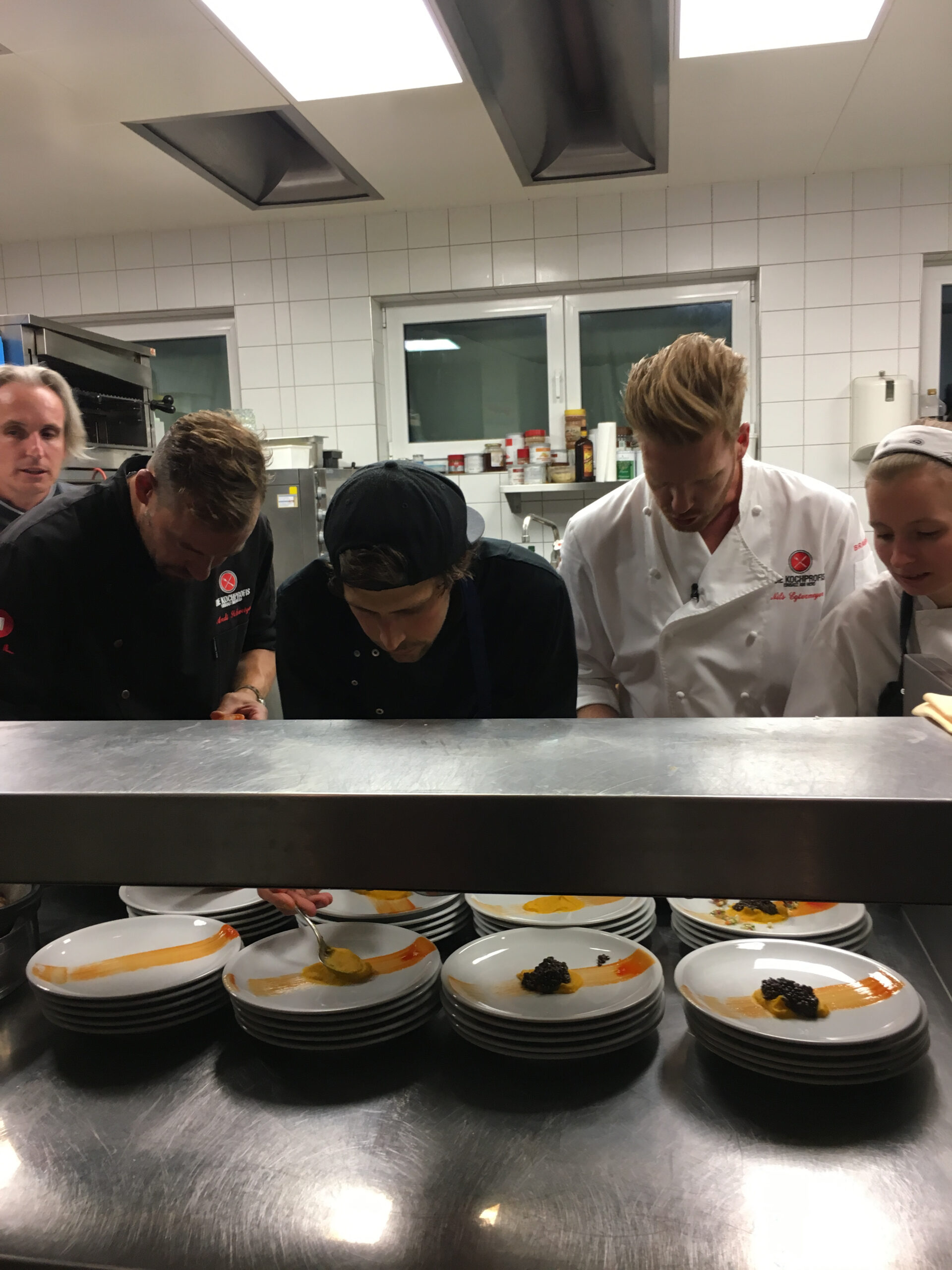 Kaum bei der Location angekommen wurde ich ins kalte Wasser geschmissen: Einmal rein in die Küche zu den Kochprofis Andi, Nils und Frank um euch vorzustellen (natürlich vor der Kamera), hieß es vom Aufnahmeleiter. Gesagt, getan – nach dem 3. Anlauf, war es dann auch „passend“ und wir durften uns ein bisschen in der Küche umsehen und Fotos schießen. Wir fühlten uns sofort wohl und wurden vom gesamten Team sehr herzlich aufgenommen. Ich war sehr überrascht, mit welch einer Ruhe und Gelassenheit das gesamte Team agierte und wie gut die Stimmung hinter den Kulissen war.